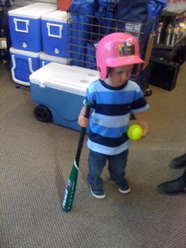 Luke is really coming into his own. Lately he is all about the color pink and anything to do with balls. While we were picking out Sophia's softball stuff at Modell's yesterday, he insisted on this pink batting helmet (and Sophia chose metallic blue, go figure!), you know the one with the hole in the back for the pony tail. It was too cute. I had to snap a picture! Luckily, we avoided tantrum #569 for the day by offering a gumball from the machine by the checkout.